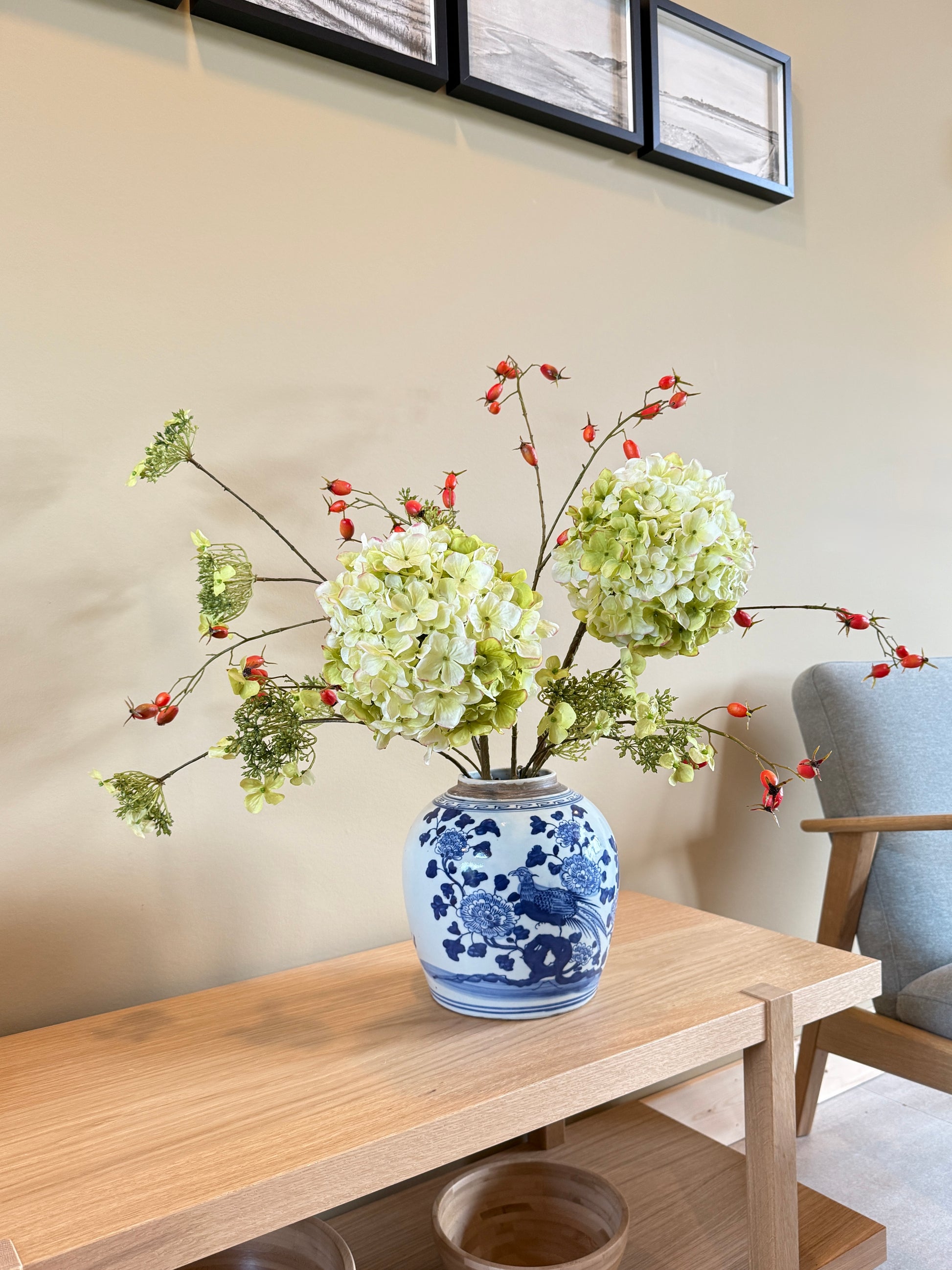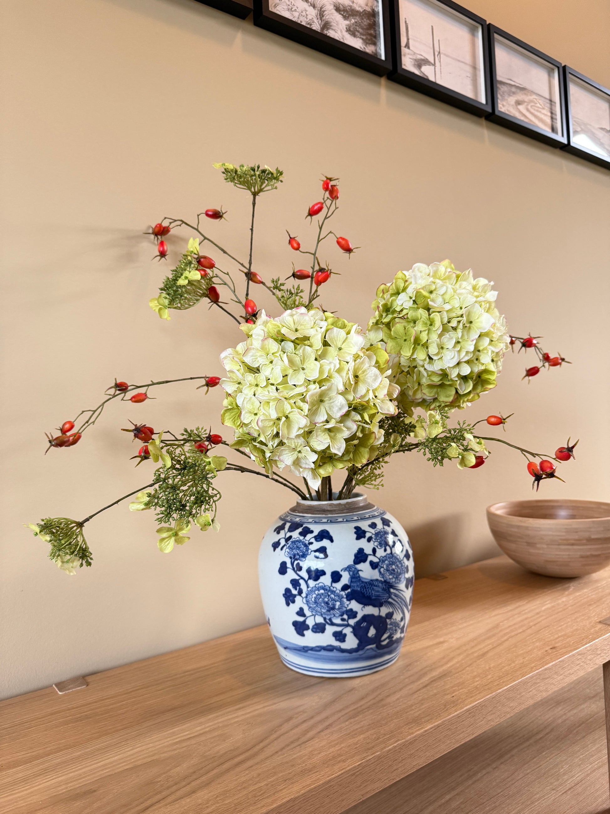 The carefully selected premium artificial flowers, such as artfully crafted hydrangeas in various shades of green and decorative rosehip branches, lend this arrangement an authentic look and make it a real eye-catcher. Whether on the dining table, sideboard, or as stylish office decoration.