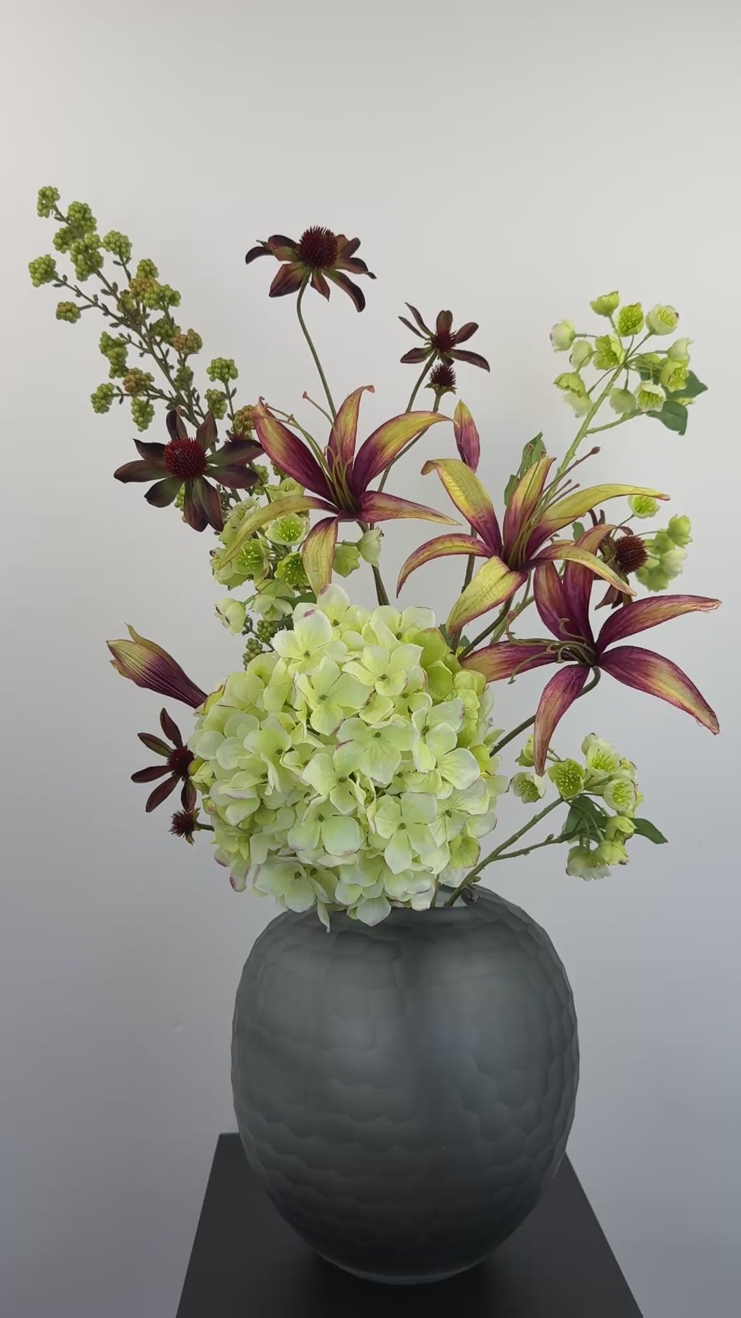 Dieses exklusive Bouquet kombiniert helle Hortensien, den zarten Liebesperlenstrauch in Grün, Sonnenhut in Bordeaux, elegante Christrosen sowie feine Lilien. Die Detailverliebtheit sorgt für eine natürliche Optik und verleiht dem Bouquet eine besondere Raffinesse.